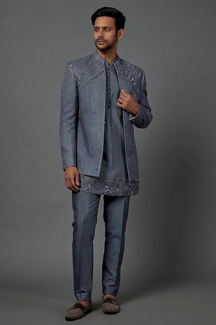 Featuring a bluish grey jacket in silk base with texture and metallic details. It is paired with a matching kurta and pants.
